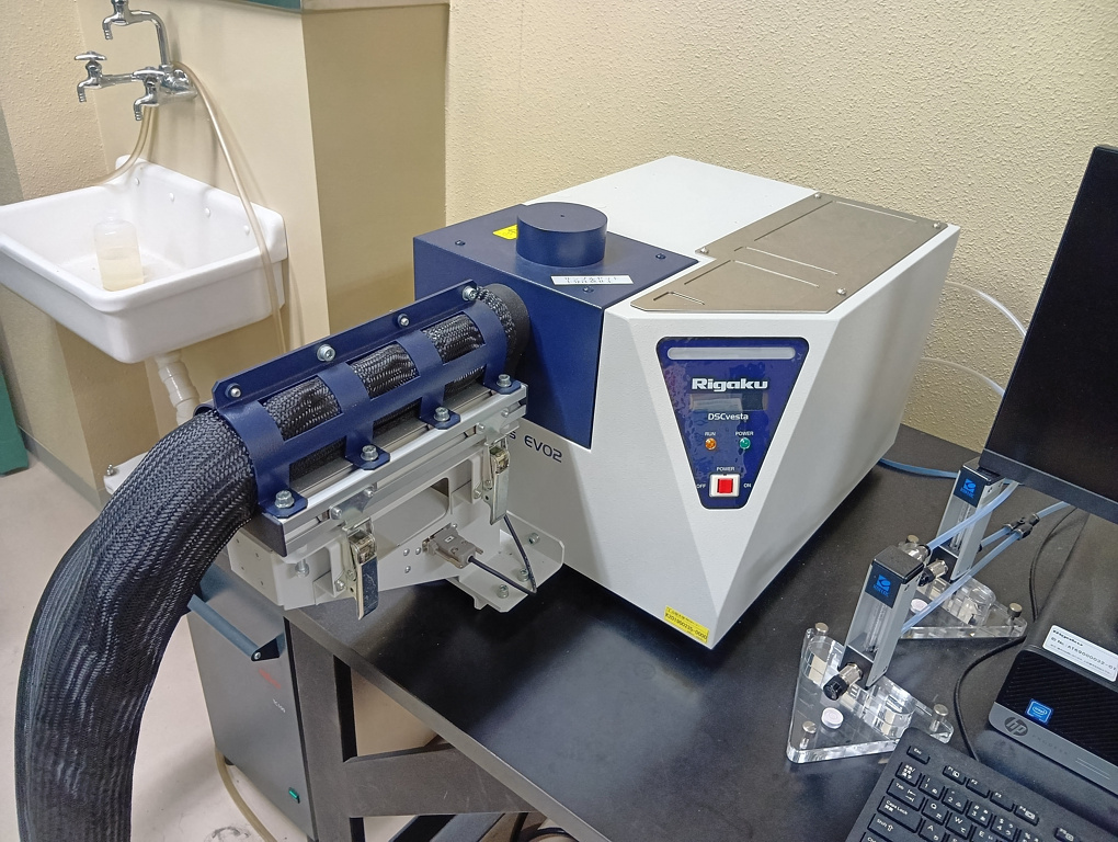 示差走査熱量分析装置(DSC)はプログラムされた通りに試料温度を変化させ、そのときの熱挙動を調べる装置です。DTAとよく似ていますが、試料に出入りする熱流(吸熱・発熱)を直接測定し、測定試料と基準試料間の熱流量の差を時間または温度に対してプロットします。DTAに比べて感度が高く、定量性があります。